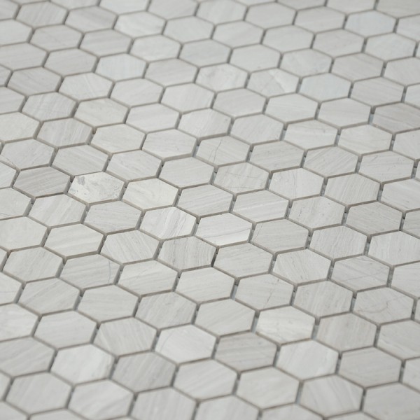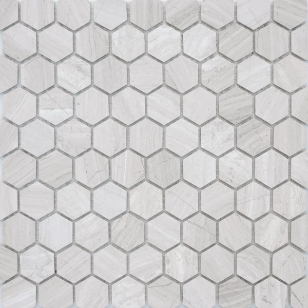 Натуральный серый мрамор в форме шестиугольника (гексагон). Матовая поверхность достигается способом, похожим на формирование морской гальки, благодаря чему поверхность получается без острых зазубрин и приятная на ощупь. При использовании эпоксидной затирки, попробуйте её сначала на малозаметном участке, т.к. под её воздействием без специальных защитных пропиток камень может слегка изменить оттенок.